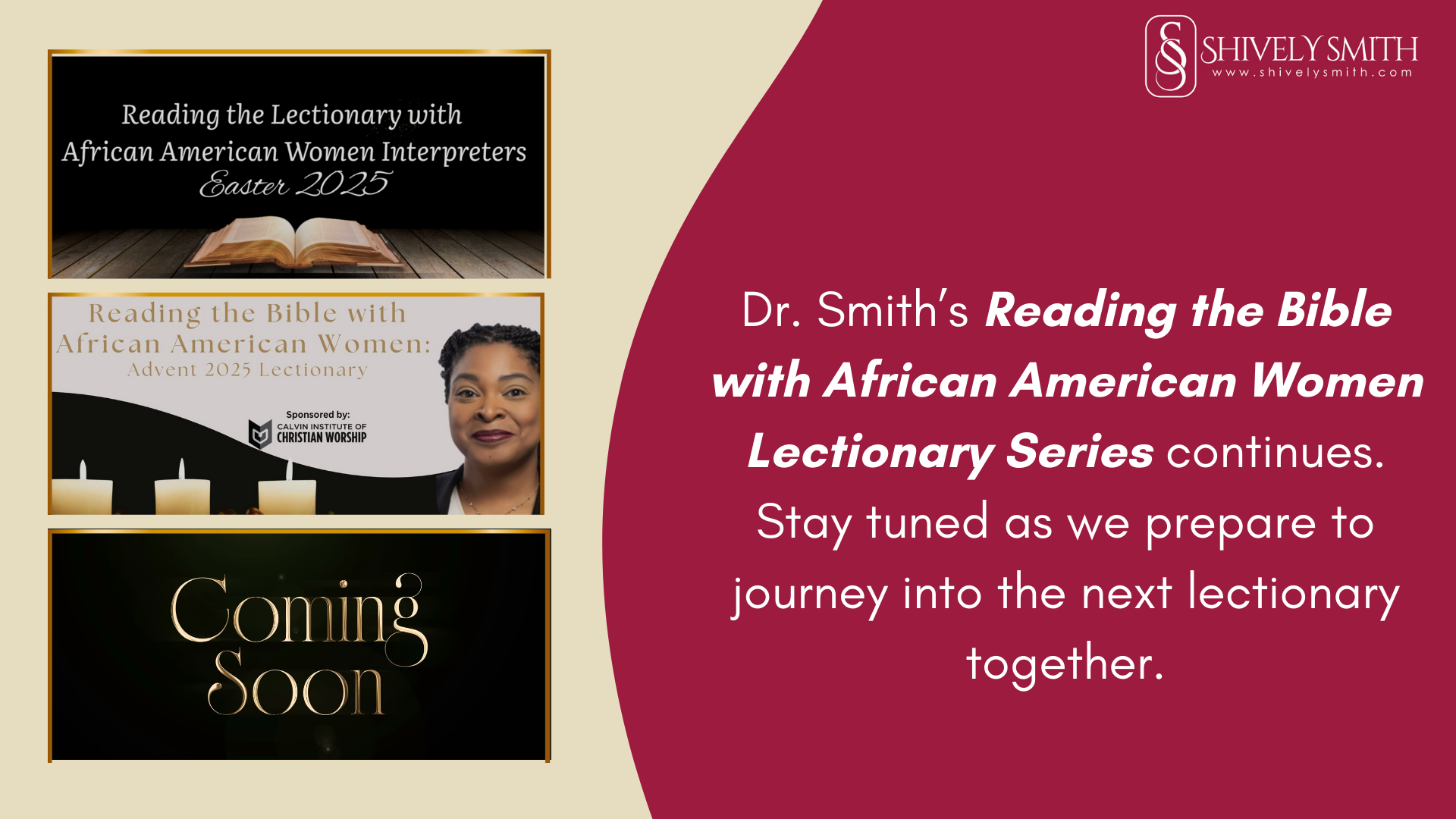 Welcome, beloved friends and family, to Reading the Bible with African American Women, a growing lectionary series led by Dr. Smith. This sacred work currently includes two distinct series, with more to come, as we continue to read, reflect, and engage Scripture through the wisdom, voices, and lived experiences of African American women.